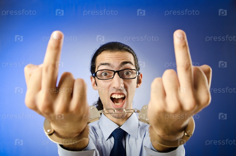 Молодой мужчина в наручниках показывает неприличный жест
