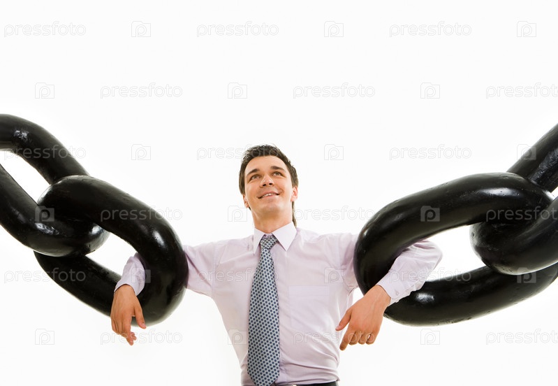 Портрет влиятельного бизнесмена, держащего две части огромной цепи за руки и смотрящего вверх с улыбкой на белом фоне