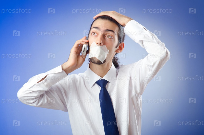 Бизнесмен с заклеенным ртом разговаривает по телефону