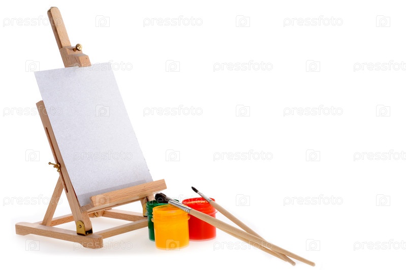 Гуашь, кисти и мольберт на белом фоне