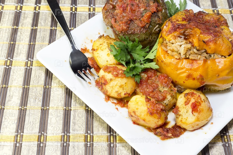 Сладкий болгарский перец, фаршированный овощами и картофель (Греческая кухня)