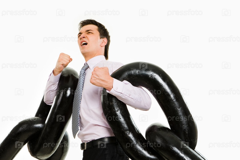 Портрет напряженного бизнесмена с двумя частями огромной цепи, показывающей ее тяжесть
