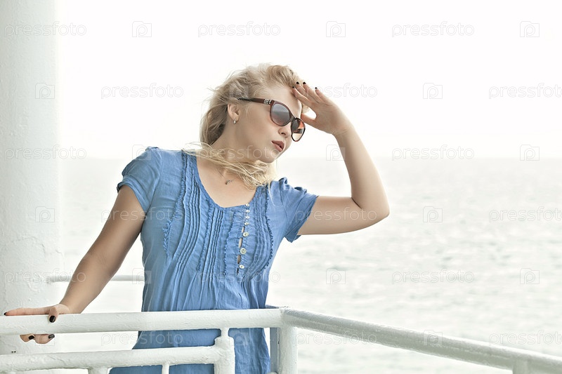 Девушка стоит у перил и смотрит вдаль на фоне океана