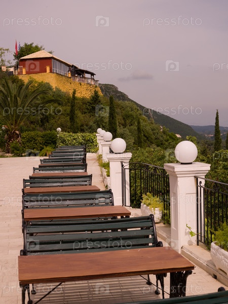 Пустые столы и скамейки в Корфу