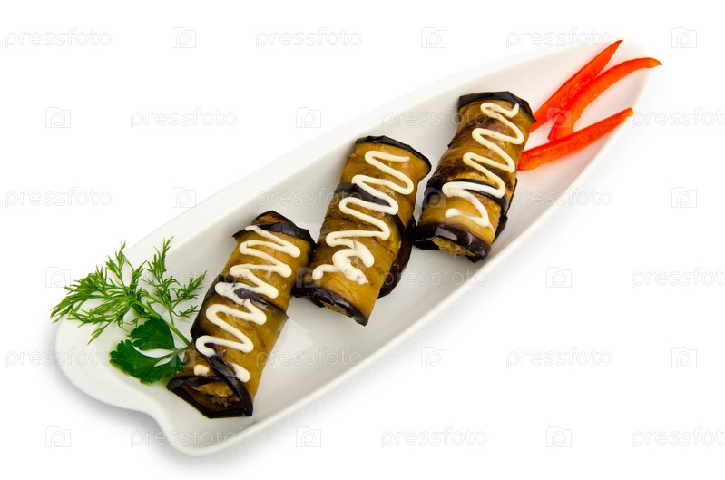 Фаршированные рулетики из баклажана в тарелке на белом фоне