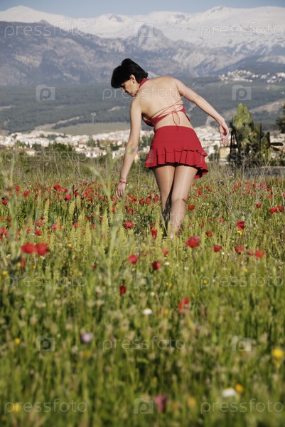 Леди в красном в области полевых цветов, Гранада, Испания