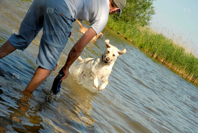 Человек играет с собакой в озере