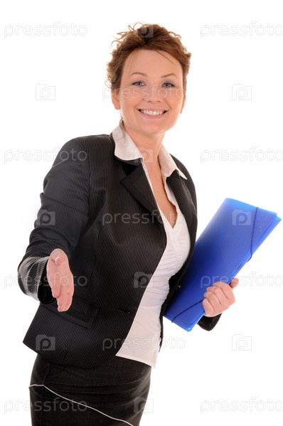 Привлекательная бизнес-леди с синей папкой на белом фоне