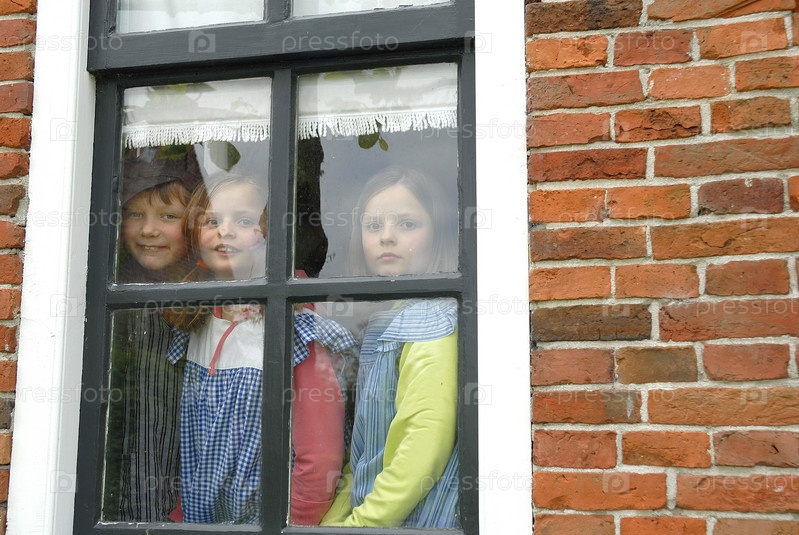 Мальчик с двумя сестрами глядя через окно