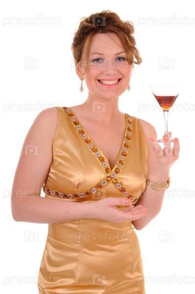 Привлекательная девушка с коктейлем в золотом платье