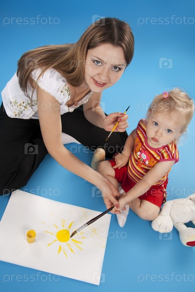 Мать и дочь рисуют красками солнце, изолированные на синем фоне