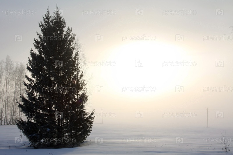 Пейзаж, ель и туманный рассвет