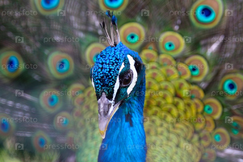 Фотография головы павлина на фоне хвоста