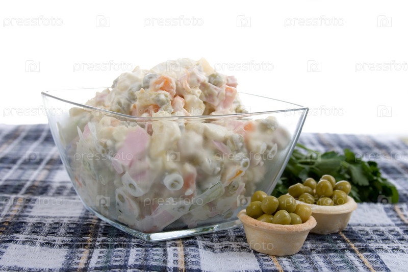 Салат Оливье и зеленый горошек на столе