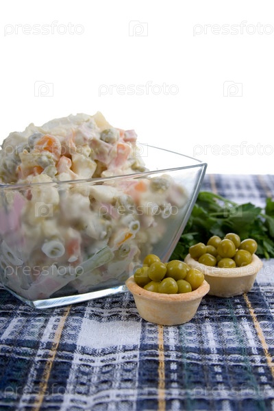 Салат Оливье и зеленый горошек на столе