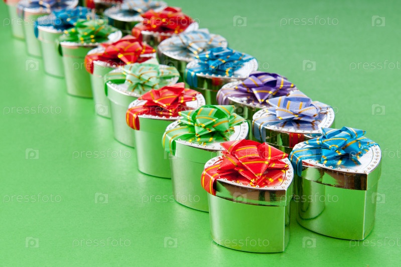 Подарки в коробочках на зеленом фоне