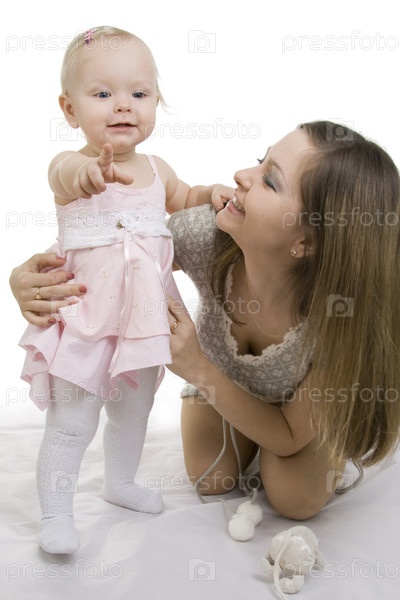 Молодая мама с маленькой дочкой на белом фоне