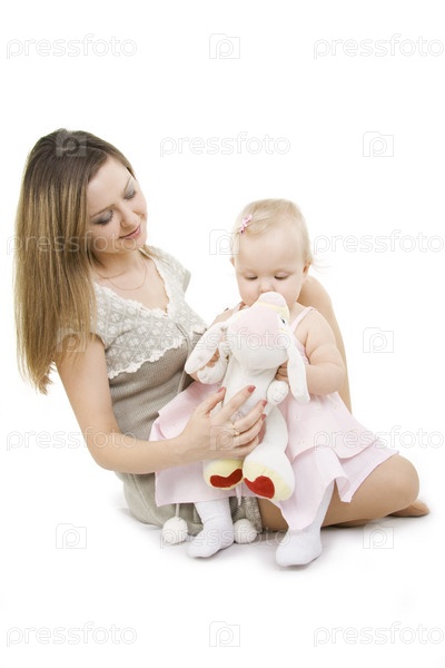 Молодая мама с маленькой дочкой на белом фоне