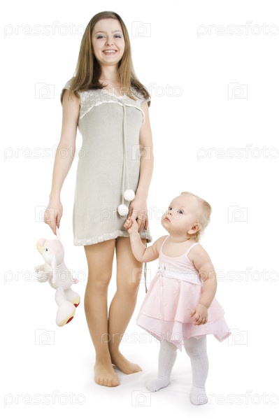 Молодая мама с маленькой дочкой на белом фоне
