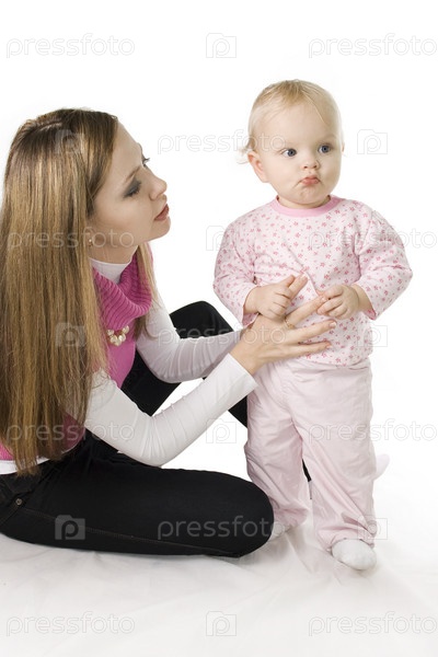 Молодая мама с маленькой дочкой на белом фоне