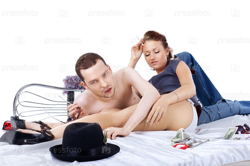 Молодые мужчина и женщина на кровати с похмелья