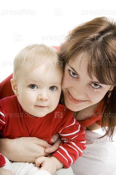 Молодая мама и сын на белом фоне