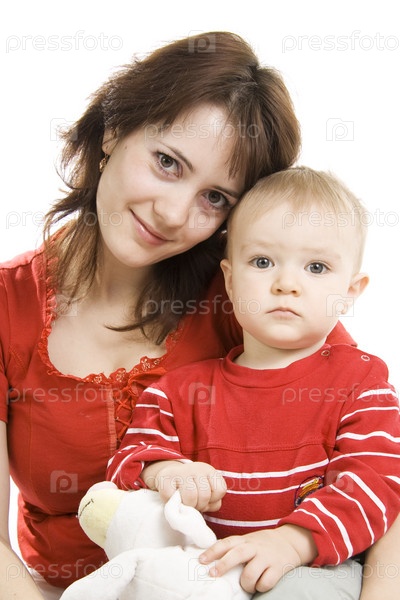 Молодая мама и сын на белом фоне