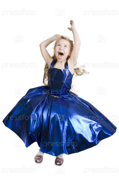 Маленькая девочка в синем платье на белом фоне