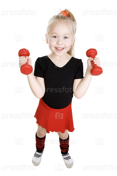 Маленькая девочка с гантелями в руках на белом фоне