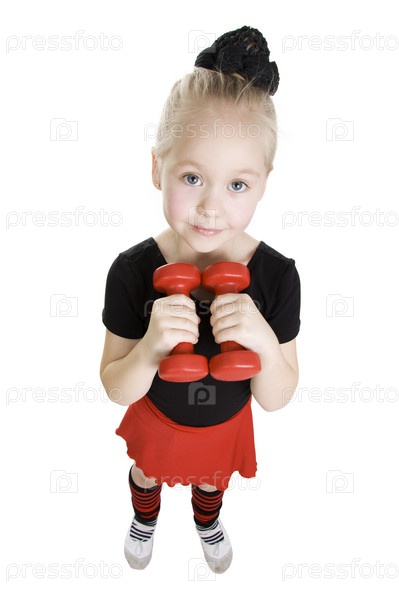 Маленькая девочка с гантелями в руках на белом фоне