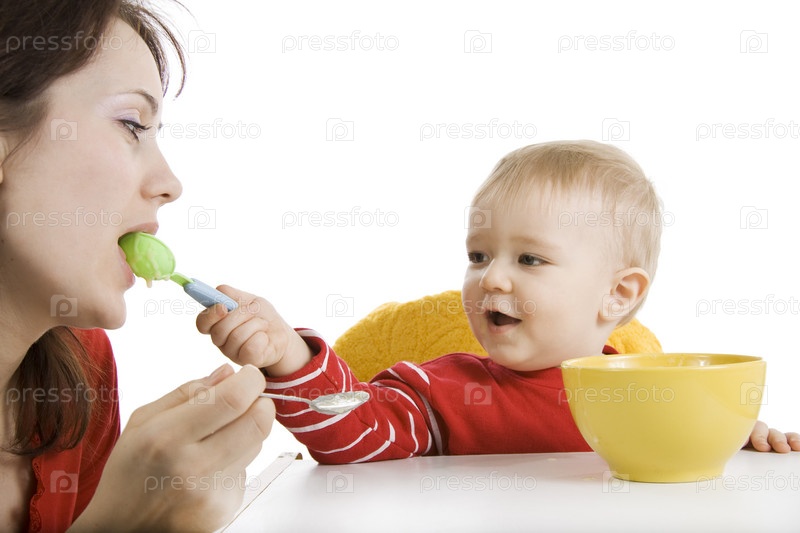 Маленький сын кормит мать с ложки