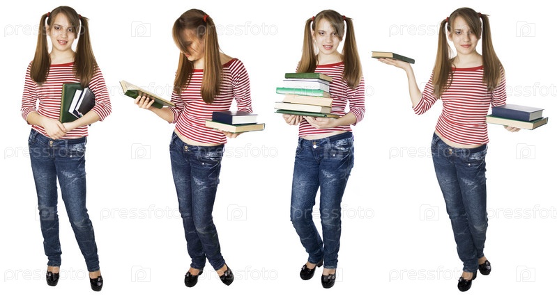 Коллаж из фотографий девушки с книгой на белом фоне