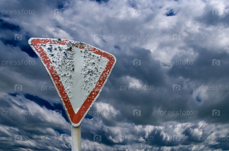 Простреленный дорожный знак на фоне пасмурного неба