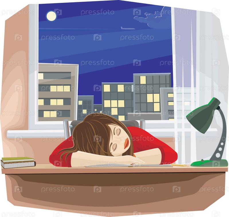 Девушка спит за письменным столом