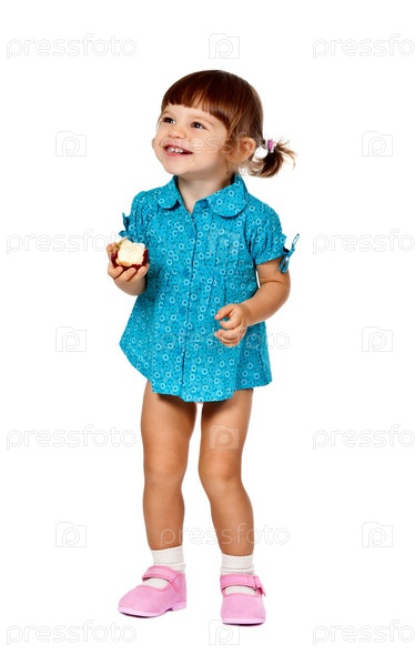 Маленькая девочка стоит и ест яблоко