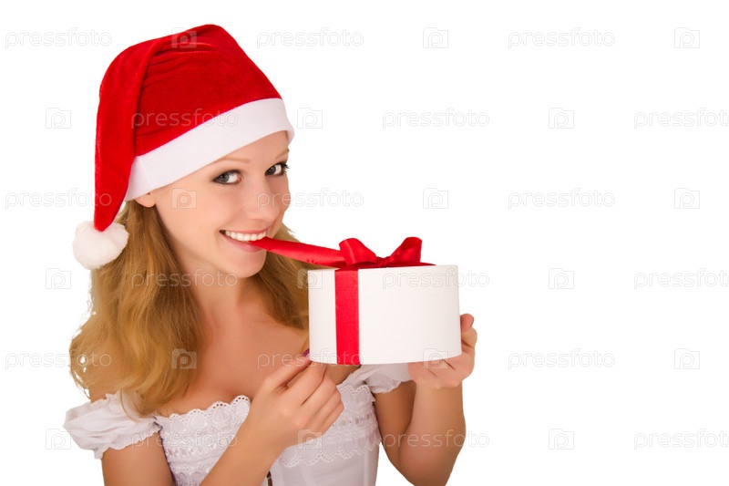Девушка в новогоднем колпаке с подарком в руках