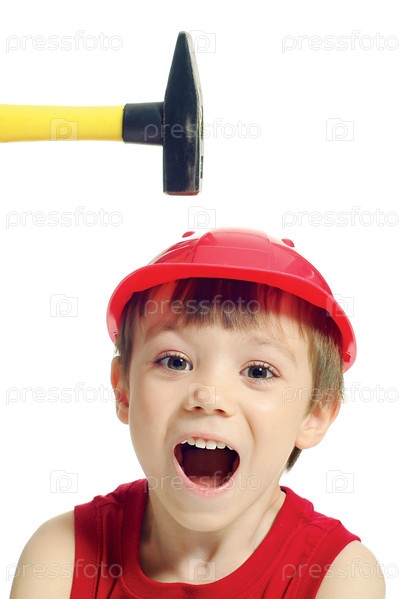 Молоток над головой мальчика в строительной каске