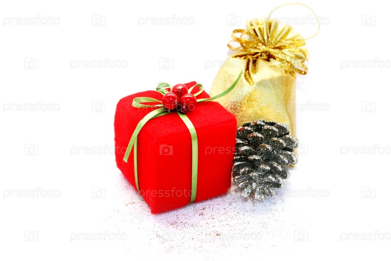 Рождественский подарок, сосновая шишка и мешок на белом фоне