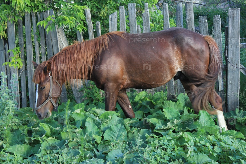 Коричневая лошадь жует траву около забора