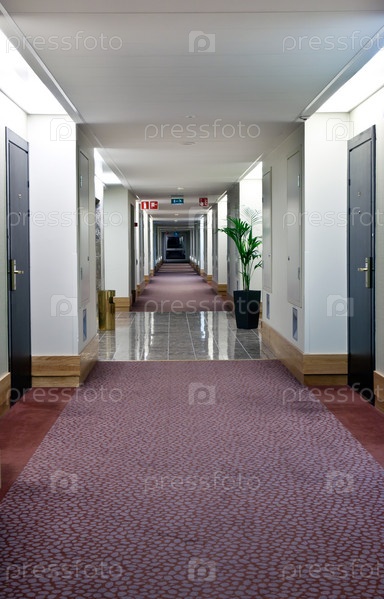 Коридор отеля со знаками безопасности