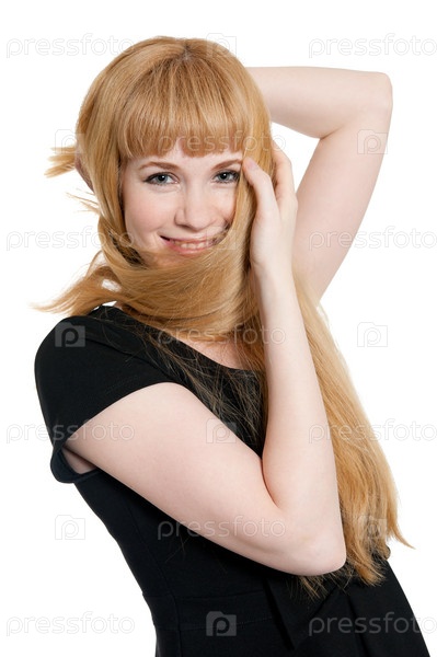 Блондинка с длинными волосами в черном платье на белом фоне