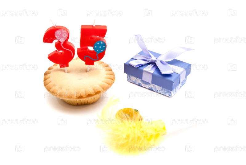 Кекс с тридцати пяти лет день рождения свечи, свисток и подарок