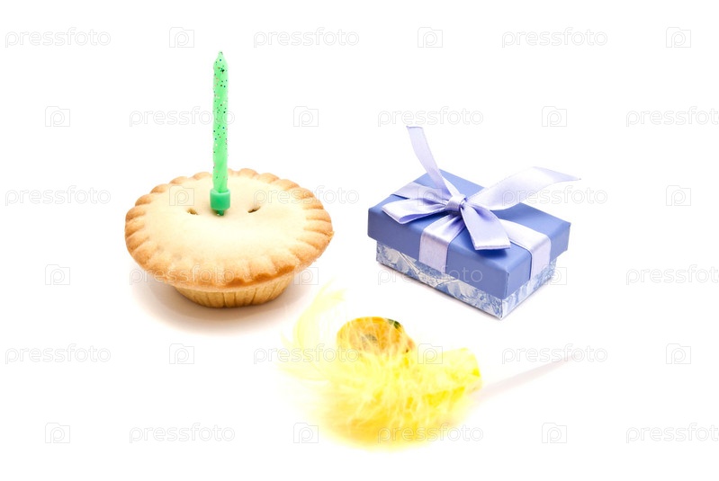 Кекс с зеленым рождения свечи, свисток и подарок на белом