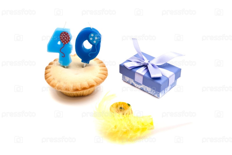 Кекс с сорок лет день рождения свечи, свисток и подарок
