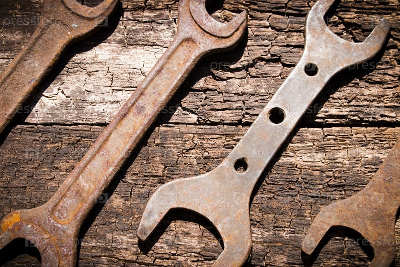 Ржавые железные инструменты гаечный ключ на старый деревянный стол крупным планом