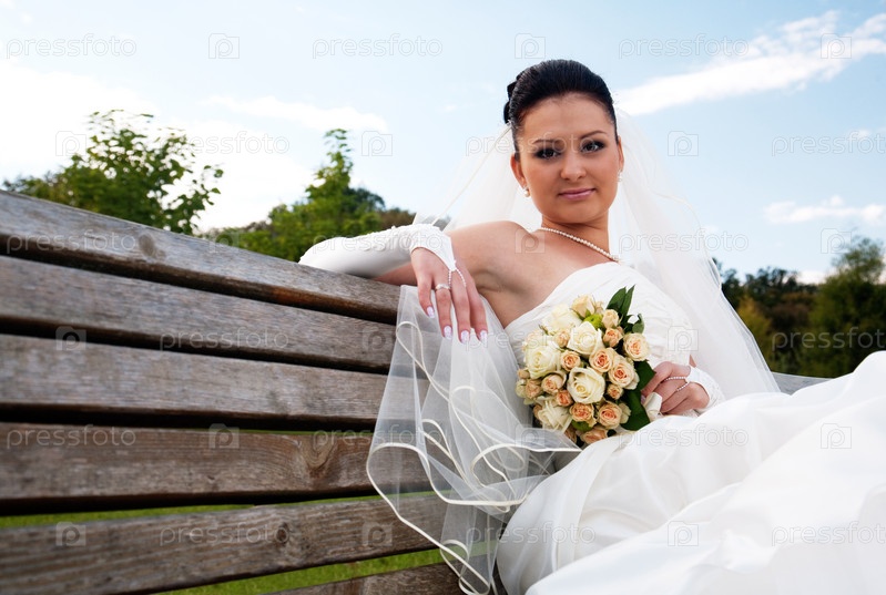 Красивая невеста на скамейке