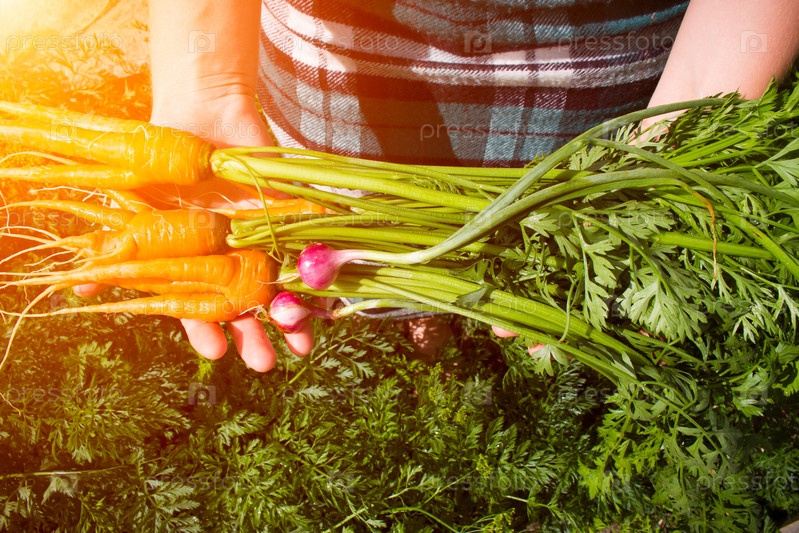 Фермер держит урожай моркови и лука
