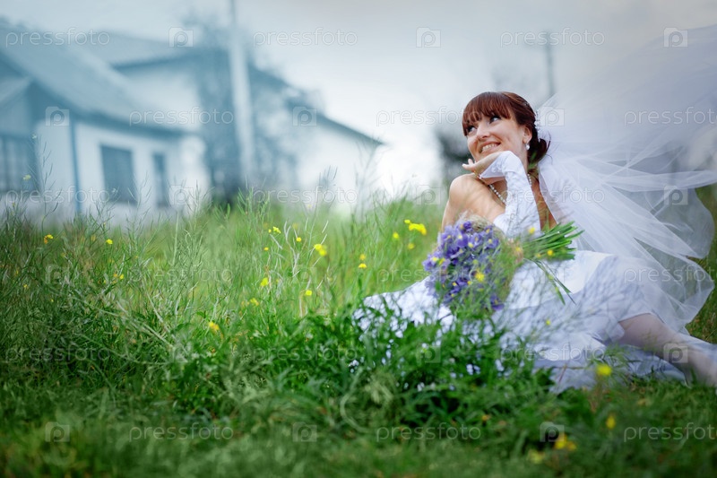 Счастливая невеста позирует на траве