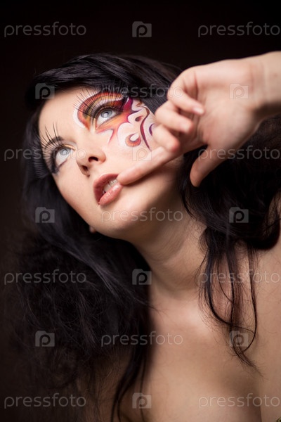 Мода, модель с расписанным лицом и пальцем на губах