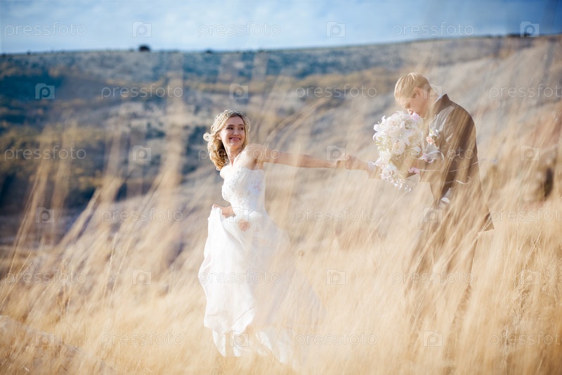 Жених и невеста сфотографированы сквозь траву